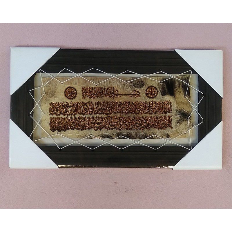 BismillahKami menjual Kaligrafi Kulit Kambing dengan diskripsi produk sebagai berikut:Nama Produk : Kaligrafi Ayat KursiUkuran : 20cm X 40cm X 3cmBahan Bingkai : Kayu Mahoni Finising Warna HitamBerat : 500 gramWarna Kulit Tidak Sama Karena Menyesuaikan dengan warna kulit