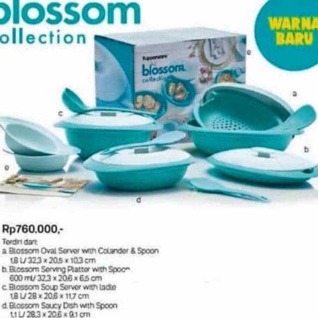 Kegunaan: Perangkat wadah saji cantik yang membuat acara makan bersama keluarga terasa semakin istimewa1 set terdiri dari:a. Blossom Oval Server with Colander & Spoon 1,8L/ 32,3 x 20,5 x 10,3 cm b. Blossom Serving Platter 600ml/ 32,3 x 20,6 x 6,5 cm c. Blossom Soup Server with ladle 1,8L/ 28 x 20,6 x 11,7 cm d. Blossom Saucy Dish 1,1L/ 28,3 x 20,6 x 9,1 cme. Blossom Bowl (2pcs)f. Booklet & Gift BoxFITUR:- Terdapat pegangan di pinggiran wadah, sehingga mudah saat dibawa atau dipindahkan.- Terdapat spoon slot agar cover tetap dapat menutup meskipun spoon ada di dalam wadah.- Spoon dapat diletakkan melekat di bagian atas handle cover, menjaga spoon agar tetap higienis saat sedang tak digunakan dan juga agar tak mudah terjatuh.- Sudut tumpul, sehingga mudah untuk menyendok sisa makanan.- Dilengkapi cover, sehingga Blossom Collection memiliki 3 fungsi sekaligus, yaitu reheat (menghangatkan dalam microwave), serving (menyajikan hidangan di meja makan), dan stoage (menyimpan kelebihan makanan yang dapat langsung disimpan dalam kulkas).- Bagian luar, base bertekstur lebih kasar agar tak mudah tergelincir saat diletakkan di meja. Sedangkan pada bagian dalamnya lebih licin untuk memudahkan menyendok makanan dan juga lebih mudah untuk dibersihkan.- Selain untuk penggunaan sendiri, produk ini juga bisa dijadikan sebagai bingkisan cantik dan tak terlupakan untuk kerabat, karena dilengkapi dengan Inner Bo