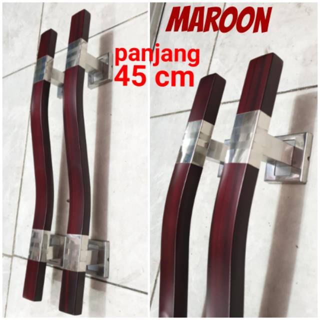 handle pintu stainless panjang 45cm x lebar 3cm KAKI KOTAK. model S MINIMALIS.tersedia 3 warna- maroon- coklat- full stainlessuntuk pemesanan warna harap tulis dicatatan. jika tidak akan dikirim acak warna.HARGA TERSEBUT DAPATNYA SEPASANG (2 PEGA