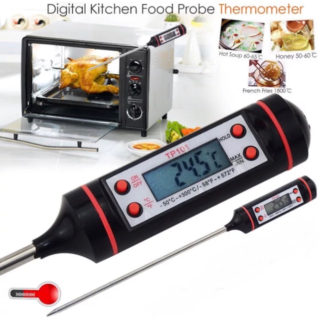 TP101 Thermometer Kopi Masak - Digital Cooking Food Probe Meat Kitchen BBQ Selectable SensorModel: TP101 electronic digital food thermometer The probe is made of imported stainless steel Weight: 0.1kg/piece Product list: one thermometer, one battery, one manual Scope of measurement: water temperature, food, liquid, paste, oil temperature, milk temperature, tea, soup, beer, etc Temperature measurement range: - 50 ℃ ~ 300 ℃ (58 ℉ ~ + 572 ℉) wide range measurement Function te point: Pen - type structure, stainless steel probe, direct measurement, easy to carry. Measuring range is wide. Applicable to refrigeration, heating, food processing, rubber and plastic processing and other fields. Press button function description: 1, ON/OFF: switch function 2, C/F: Celsius/Fahrenheit conversion 3. HOLD: temperature lock function. Press this button, and then the temperature is locked. 4, MAX/MIN: high temperature and low temperature memory, press this button to display the high temperature of the previous time, press again to display the low temperature of the previous time, and press again to restore the temperature measurement state. Technical data: Temperature measurement range: - 50 ℃ ~ + 300 ℃ (572-58 ℉ ~ +) Points to contend rate: 0.1 ℃ Accuracy of the essence: + / - 1 ℃ (- 20 ℃ ~ + 80 ℃) plus or minus 2 ℃ (other) Power saving mode: automatic power saving function of 10 minutes Power source: AG13 button battery 1 Length: 225mm Net length of probe rod: 145mm Display size: 21mm x