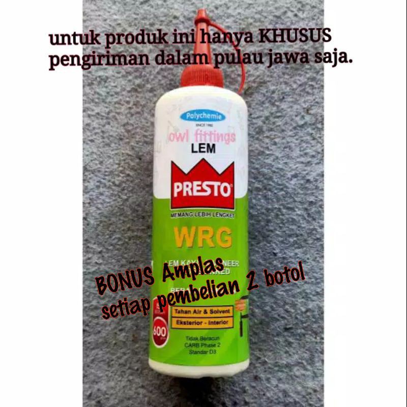 PENTING..!!! Harap dibaca..!!KHUSUS PULAU JAWA SAJA..!!KARENA BANYAK NYA REJECT BARANG TIDAK LOLOS X RAY DI BANDARA KARENA PENGIRIMAN LEM CAIR.Mohon maaf jika order dr luar pulau jawa, tidak akan diproses.Manufacturer : PT.Polychemie Asia Pacific PermaiLem KayuBrand : PrestoTipe : WRG ( Tahan Air )Isi : 600 Gram- Tahan air- Tahan Panas. - Tahan Solven. - Cepat kering (+- 5 menit s/d 10 menit).- Warna menyerupai warna kayu (tidak ada garis lem).- Tidak mengandung formal*n. - Cocok u/ menempelkan : Kayu - Kayu, Kayu - HPL, Kayu - Veneer, Kayu - Kertas, Kayu - Keramik. - Aplikasi : Penebalan, Perakitan, Penyambungan, Pelapisan, Kayu dgn kelembaban 8-12% (kayu kering).Lem Presto WRG adalah lem kayu teknologi Aliphatic seperti PRESTO DN, namun telah ditambahkan FITUR TAHAN AIR, sehingga cocok untuk EKSTERIOR.Perbedaan paling menonjol dari lem aliphatic apabila dibandingkan dengan lem PVAc biasa adalah ketahanan tinggi terhadap solvent seperti thinner yang seringkali digunakan untuk mempersiapkan permukaan kayu untuk proses finishing dan juga tidak akan menempel pada amplas pada saat kering sehingga dapat menghemat pemakaian amplas. Selain itu, lem aliphatic telah diformulasikan untuk memiliki warna krem yang menyerupai warna kayu yang ditempel, beda dengan lem PVAc yang memiliki warna putih. Dan kecepatan keringnya yang lebih cepat dari lem PVAc biasa. Apalagi lem Presto WRG ini tahan air.Lem Presto WRG juga telah lulus sertifikasi JAIA F**** dari Jepang dan CARB Phase 2 dari USA. Dengan memakai Lem Presto WRG, anda berarti telah menciptakan furniture kayu menggunakan lem berstandar internasional dan sekaligus membantu menjaga kesehatan keluarga customer anda yang akan menggunakan furniture kayu buatan anda untuk 20-30 tahun kedepan!pembelian khusus J