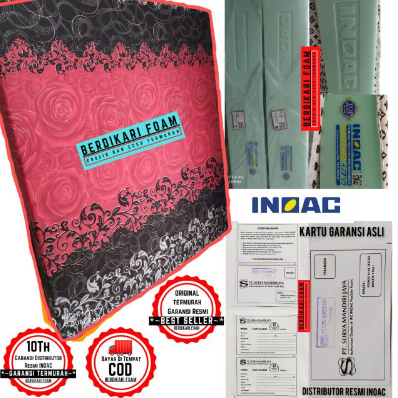 READY STOK SEMUA UKURAN(silahkan cek etalase)*Jangan takut ongkir mahal. Kami siap bantu beri solusi.chat kami terlebih dahulu.*Kami seller baru di shopee jadi blm ada penjualan.Selamat datang di lapak INOAC BERDIKARI FOAM##Di jamin harga paling murah.Beli eceran harga grosir.Beli grosir harga pabrik.Beli Partai Besar Harga NEGO.Garansi uang kembali 100% jika barang yg kami jual Palsu.Kami menjual berbagai produk Busa INOAC seperti:- Kasur- Sofabed Multifungsi- Kasur Lipat.Kasur Busa INOAC 200x180x40(Panjang 200cm x Lebar 180cm x Tebal 40cm)Tipe LG(Light Green) EON Density 23 dengan ciri-ciri:* Terdapat logo/stempel INOAC menempel pada busa** Terdapat Barcode pada packing plastik pabriknya. Pada Barcode menerangkan Jenis busa, Ukuran busa,tanggal produksi,dll*** Ada kartu garansi 10tahun distributor resmi INOAC#UkuranTersedia semua ukuran kasur dan sofabed.Bisa pesan ukuran sesuai kebutuhan.#Motif cover Gambar hanya contoh.Tersedia banyak pilihan motif cover. Bunga-bunga, batik, Abstrak, minimalis, kartun,club bola,dll.#Pengirimanuntuk memudahkan pengiriman barang kami vakum(di kempeskan). setelah barang sampai langsung di buka hitungan beberapa detik langsung ngembang ke ukuran semula.harga sudah termasuk biaya vakum.Kami melayani pengiriman ke seluruh Nusantara Dengan jasa ekspedisi yg murah.Jabodetabek yg masih terjangkau bisa di antar langsung.*Luar kota, luar provinsi,luar pulau jangan khawatir Ongkos kirim mahal. Konfirmasi dan tanyakan kpd kami. Dengan senang hati kami siap membantu mencarikan jasa ekspedisi yg lebih murah.(kelebihan ongkir akan di kembalikan)#Berat Barangberat barang di hitung volume(sesuai ketentuan ekspedisi jasa pengiriman)berat asli 25kg.berat volume 30kg*Melayani penjualan eceran dengan harga grosir**Melayani penjualan grosir dengan harga lebih murah***Melayani penjualan partai besar dengan harga NEGO.##Jaminan uang kembali 100% jika barang yg kami jual P