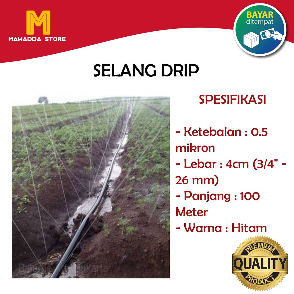 Selang Drip atau Selang InfusBahan: PE (PolyEtylen)Dimensi : Ketebalan 0.5 mikron, Lebar 4cm, Panjang 100 mWarna: HitamSlang DRIP di gunakan untuk sistem irigasi pada lahan persawahan dan perkebunan. Biasa disebut irigasi tetes (drip irrigation). Pengairan untuk tanaman sayuran dan buah memerlukan perhatian intensif karena sebagian besar bagian dari tanaman sayur dan buah terdiri dari air. Irigasi drip merupakan salah satu teknologi pengairan yang dapat digunakan untuk memudahkan irigasi sekaligus untuk menghemat air.Cara pemasangan selang drip adalah di bawah plastik mulsa dan dialiri air menggunakan pompa air pada ujung nya.Lubangi selang drip tepat pada lubang tanaman pada mulsa, dan air akan keluar dari lubang tersebut secara menetes.Cocok di gunakan pada lahan yang luas ataupun lahan yang terasiring (berbukit) karena sangat menghemat tenaga dan air.Pengairan untuk tanaman sayuran dan buah memerlukan perhatian intensif karena sebagian besar bagian dari tanaman sayur dan buah terdiri dari air.Irigasi drip merupakan salah satu teknologi pengairan yang dapat digunakan untuk memudahkan irigasi sekaligus untuk menghemat air.Selamat berbelanja. Silahkan diorder ya#selangirigasi #selangdrip #selang #selangair #selangpengairan100m #selangdrippengairan #selang