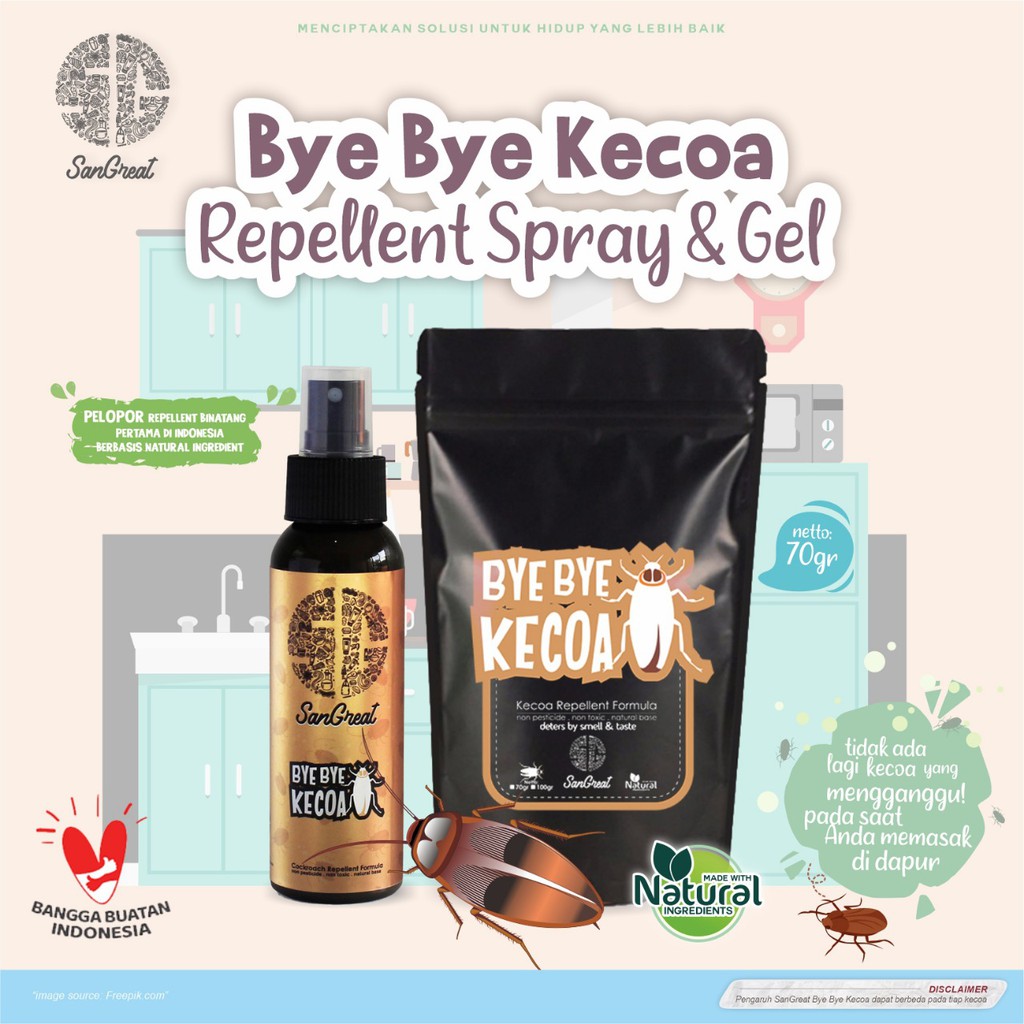 Paket Bye Bye Kecoa Gel 70 gr dan Bye Bye Kecoa Spray 100 ml Tahu kan kenapa kecoa harus di usir? Serangga ini dikatakan pengganggu karena mereka biasa hidup ditempat kotor dan dalam keadaan terganggu mengeluarkan cairan yang berbau tidak sedap. Kecoa mempunyai peranan yang cukup penting dalam penularan penyakit. Peranan tersebut antara lain : a. Sebagai vector mekanik bagi beberapa mikro organisme patogen. b. Sebagai inang perantara bagi beberapa spesies cacing. c. Menyebabkan timbulnya reaksi-reaksi alergi seperti dermatitis, gatal-gatal dan pembengkakan kelopak mata. Untuk membasmi kecoa, biasanya banyak orang menggunakan obat serangga. Padahal, menggunakan obat pengusir serangga yang beracun bisa berbahaya bagi kesehatan keluarga, lho. Agar keluarga nggak terpapar obat serangga yang beracun tersebut, lebih baik kini beralih menggunakan cara alami untuk mengusir kecoa! Tak hanya aman bagi kesehatan kelaurga, rumah pun bebas kecoa. Nah, sekarang SanGreat sudah punya Bye Bye Kecoa. Bye Bye Kecoa (BBK) adalah essensial oil yang diformulasikan khusus untuk mengusir kecoa dan mencegah kecoa bersarang di suatu tempat. Sebagian besar kecoa tidak suka wangi Bye Bye Kecoa. Sehingga kecoaakan pergi dari tempat yg tercium wangi Bye Bye Kecoa. Dengan pemakaian yang tepat dan rutin, akan memberikan efek trauma pada kecoa, sehingga kecoa akan menjauh di tempat yang diberi Bye Bye Kecoa. Bye Bye Kecoa bukan racun sehingga tidak akan membuat kecoa mati tapi dapat mengusir kecoa. Aman untuk keluarga. Fungsi Bye Bye Kecoa : Memecah teritori kecoa Mengusir kecoa tanpa membunuh Mencegah kecoa mendekati atau memasuki areal tertentu (cockroach repellent) Mencegah kecoa bersarang di suatu tempat Cara pakai: Bye Bye Kecoa Gel 1. Bersihkan area rumah secara berkala 2. Sebarkan beberapa gel Bye Bye Kecoa ke tempat yang diperlukan dengan jarak 5-10 cm. Sebaiknya disebarkan menjelang malam, saat kecoa aktif. 3. Sesuaikan jumlah gel yang disebar dengan luas area, semakin banyak gel yang disebar akan semakin efektif. 4.Gel Bye Bye Kecoa akan mengering setelah 3 -5 hari. 5. Untuk memberikan efek yang lama, gel Bye Bye Kecoa dapat disebarkan kembali setelah gel sebelumnya mengering. 6. Sebarkan Bye Bye Kecoa 2-3 kali aplikasi untuk memecah teritori kecoaBye Bye Kecoa Spray1 . Semprotkan Bye Bye Kecoa spray ke tempat yang sering dilalui kecoa atau persembunyian kecoa2. Sebaiknya disemprotkan menjelang malam, saat kecoa aktif.2.semakin sering disemprot pada area yg sering dilalui kecoa atau persembunyian kecoa semakin membuat kecoa enggan lagi bersembunyi di area tersebutWarning: efek Bye Bye Kecoa mungkin tidak sama untuk setiap k