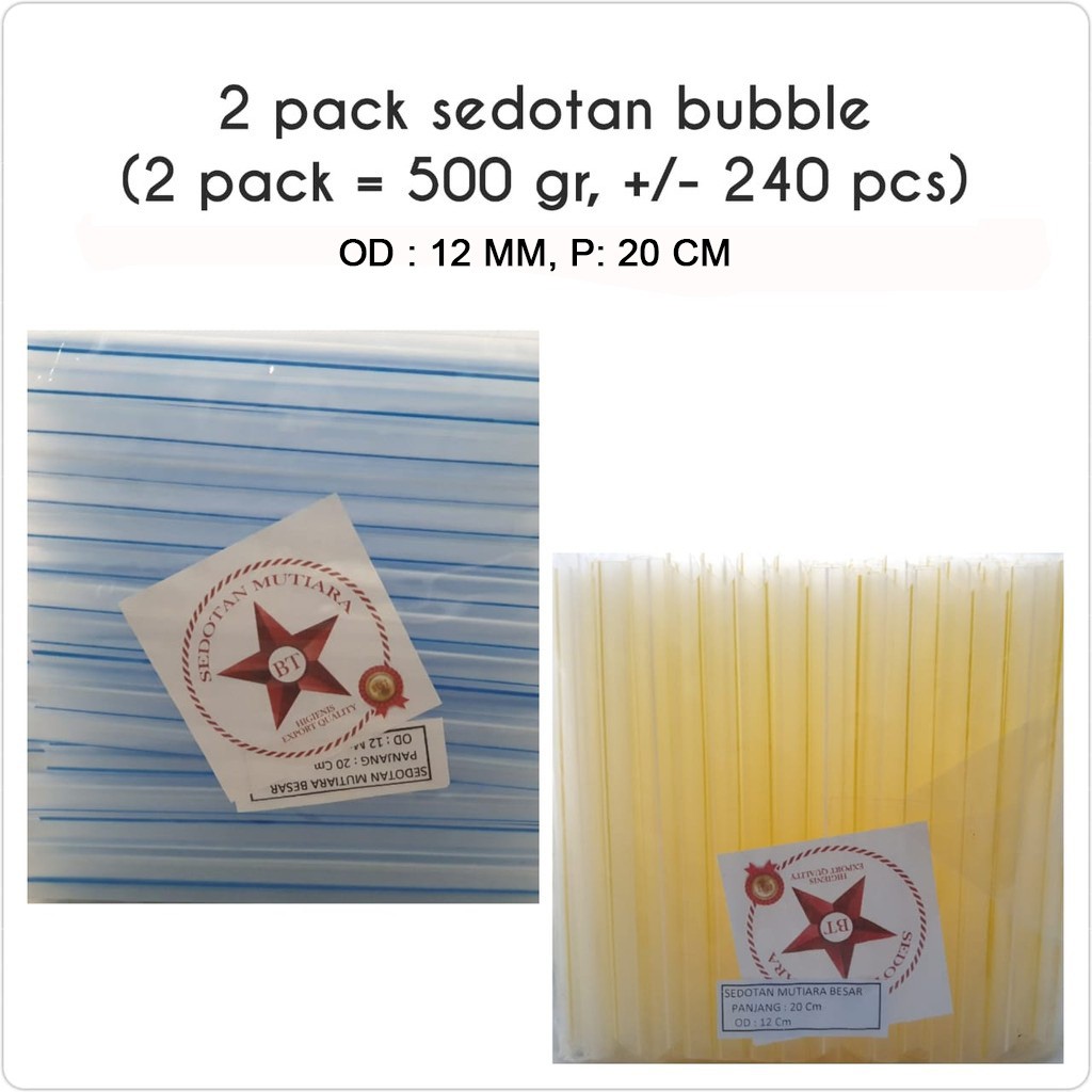 Yang anda dapatkan adalah:2 pack sedotan bubble/sedotan mutiara. 1 pack = 250gr isi kurang lebih 120 pcs, jadi 2 pack = 500gr = 240 pcsPanjang sedotan 20cm.Ukuran 12 mmWarna dikirim random sesuai stok yang ada.#sedotanbubble #sedotanmutiara #sedotanp